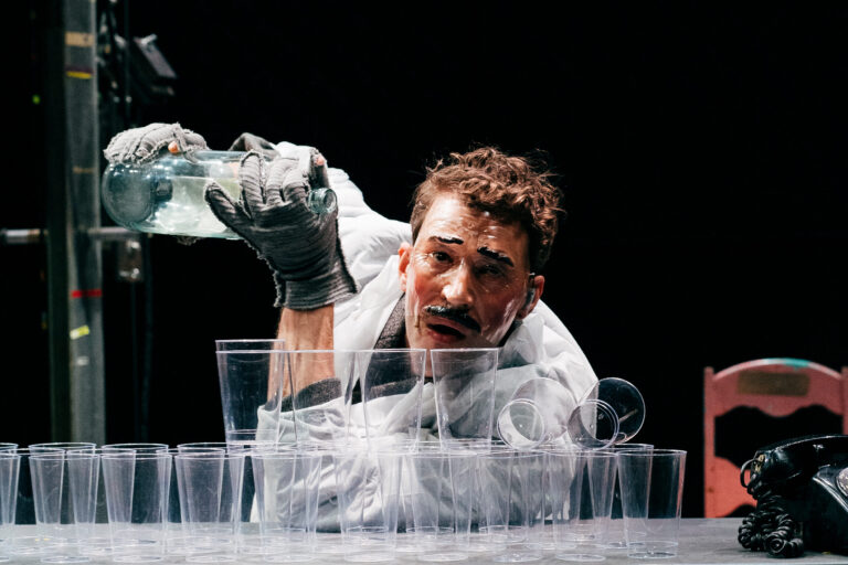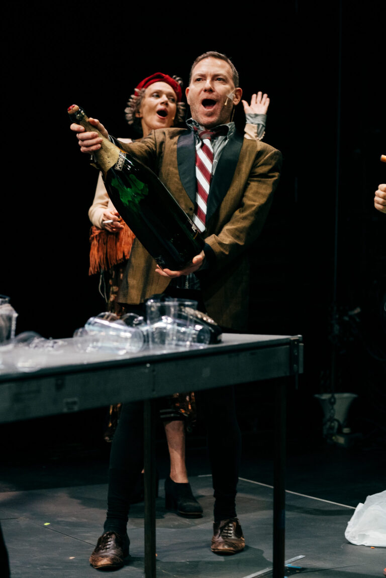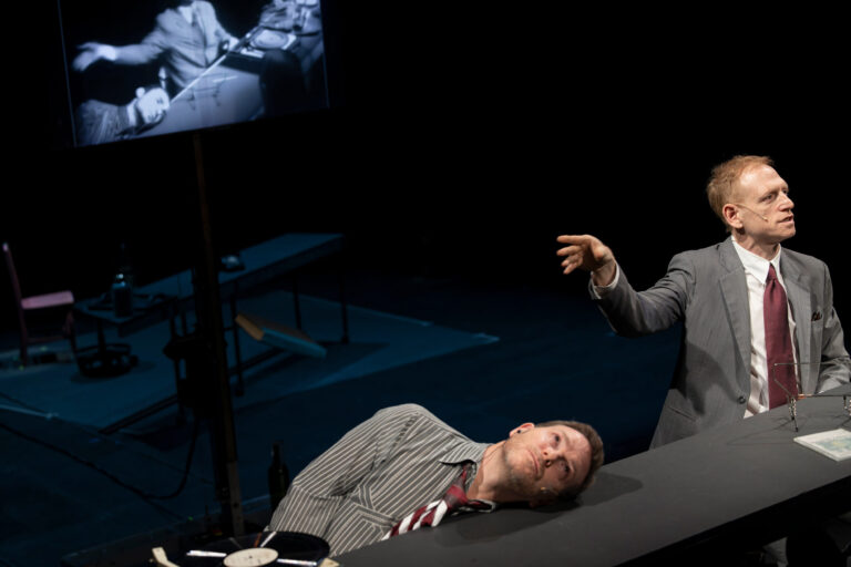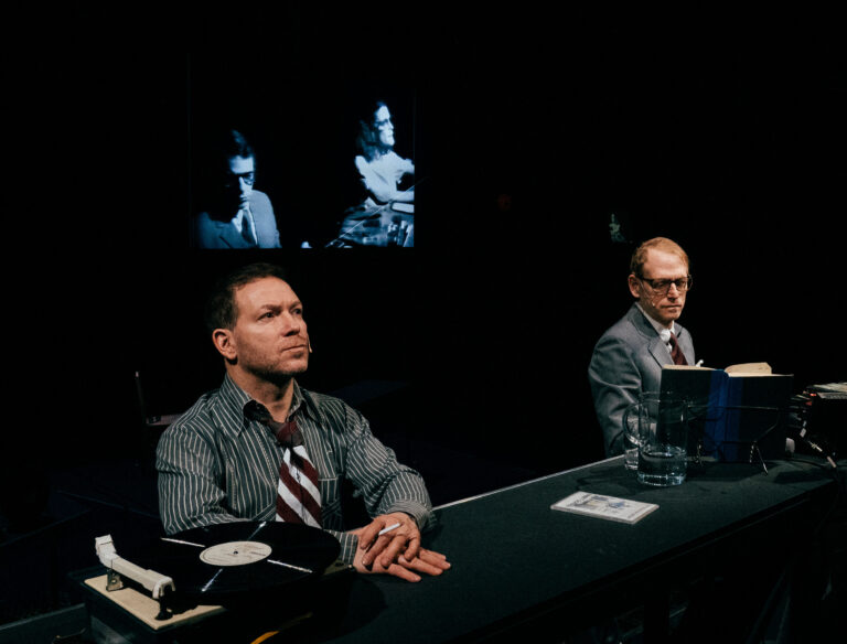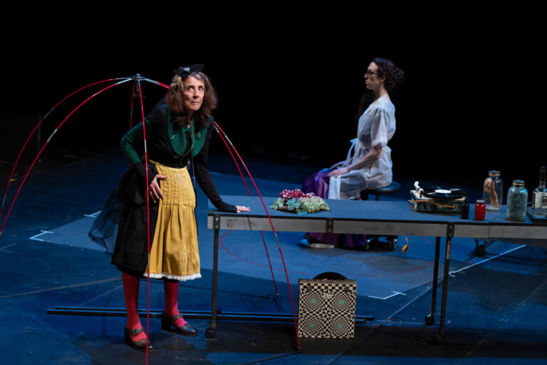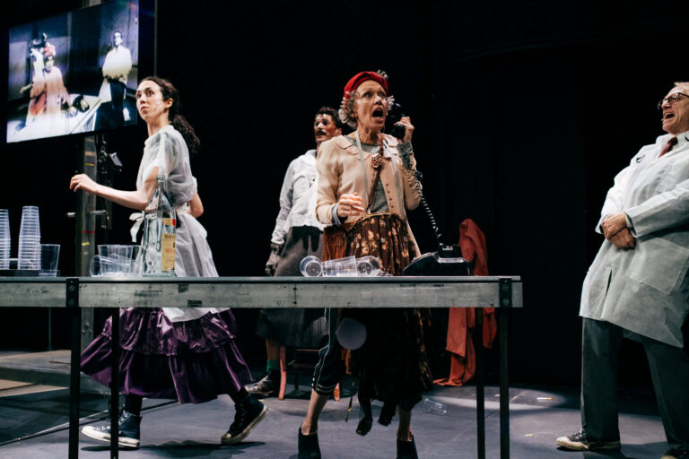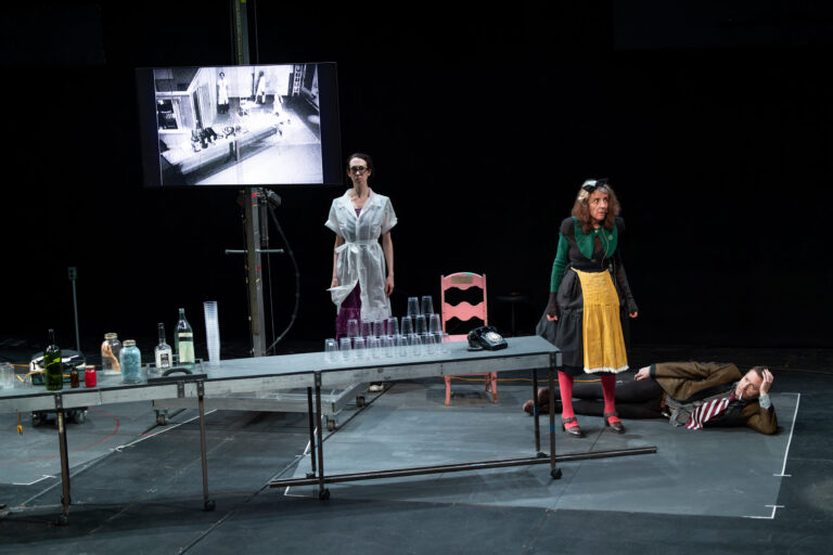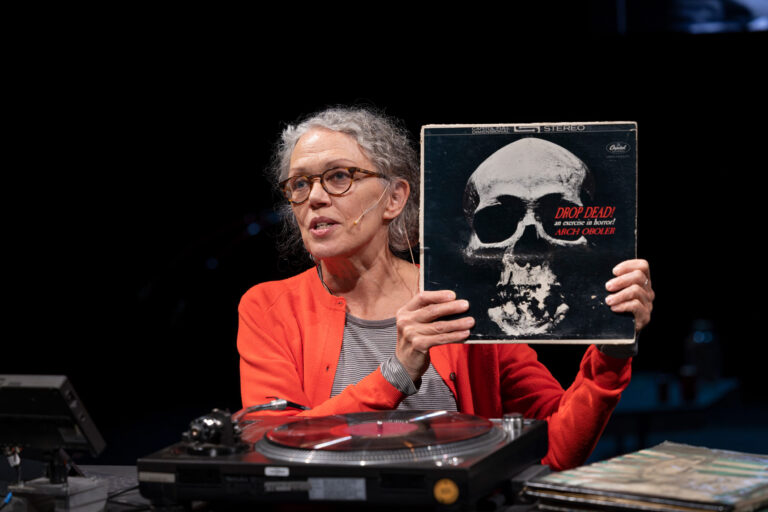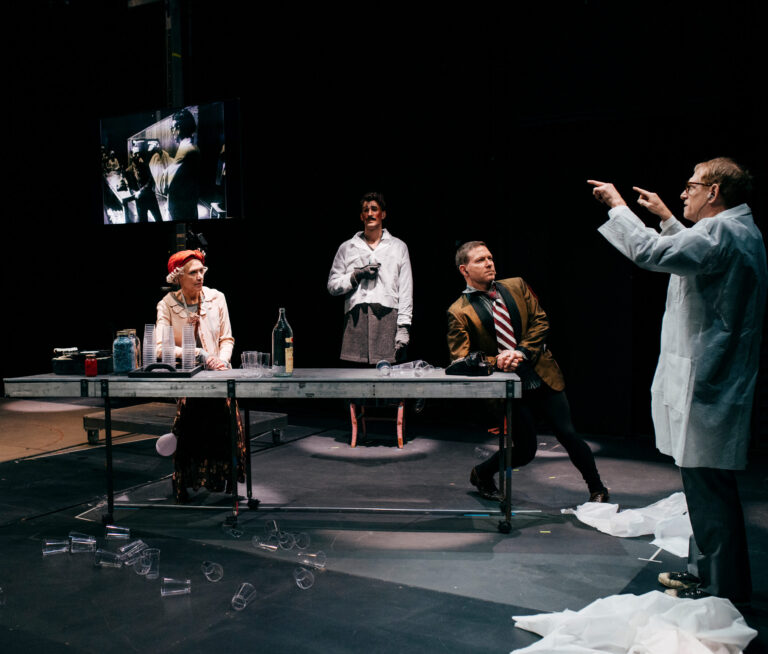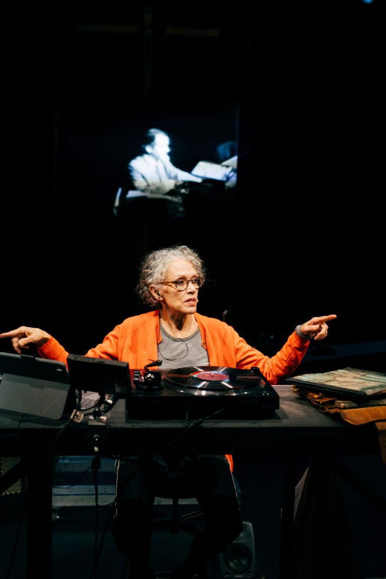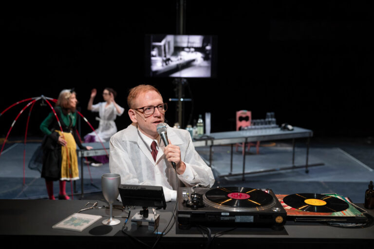 In Nayatt School Redux, directed by Elizabeth LeCompte, Kate Valk reveals newly-restore archival video recordings of Gray’s opening monologue from the original production. In it, Gray described his beginnings in the theater and played LPs from his record collection, inclduing an LP of T.S. Eliot’s The Cocktail Party. Valk tells her own stories of how she came to work with The Wooster Group in the late 1970s. Then the current company imitates, with full vigor, scenes from the original production, including the climactic sequences of The Cocktail Party.