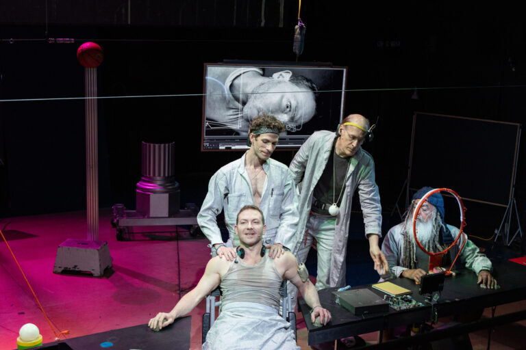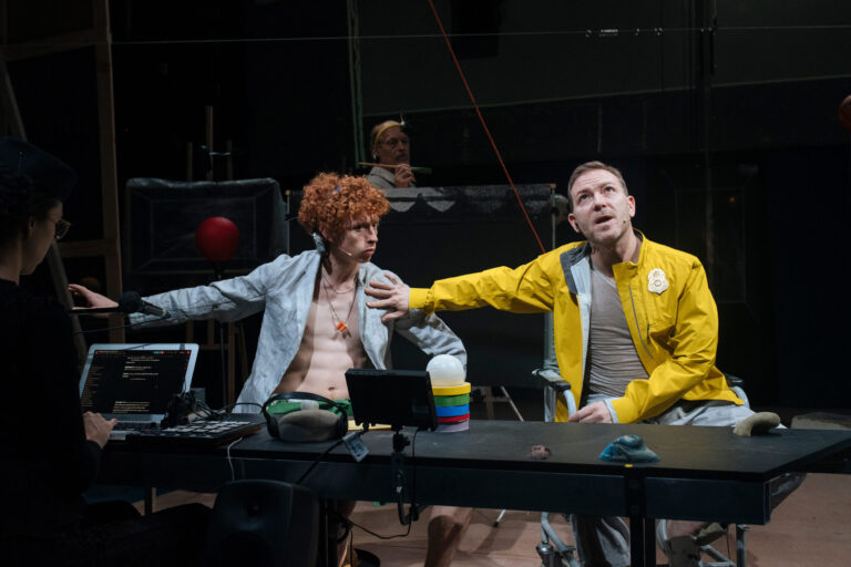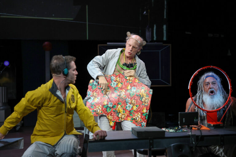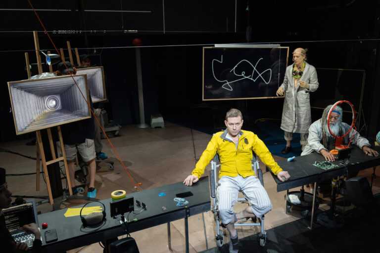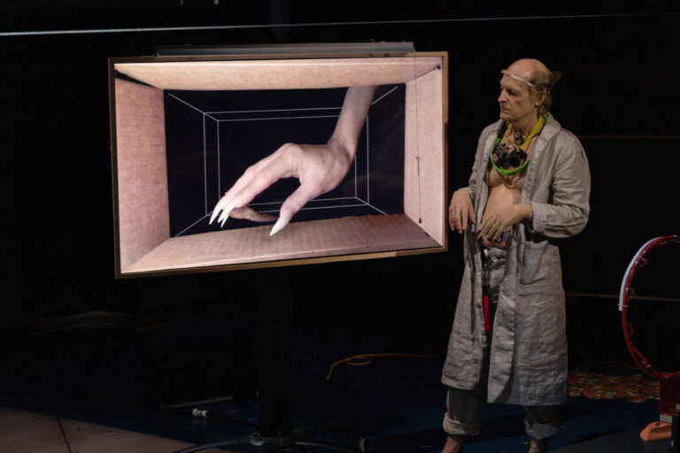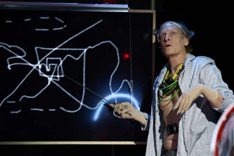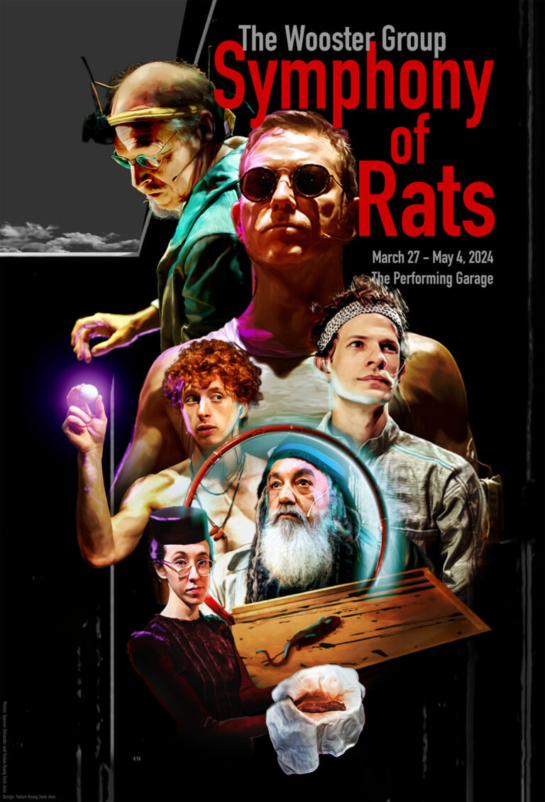 In this new Wooster Group production, directed by Elizabeth LeCompte and Kate Valk, and composed by the company, Richard Foreman’s 1988 play is reimagined with a multilayered sound and video score that draws from wide-ranging literary and cinematic sources, including William Blake, D.H. Lawrence, and Charlie Chaplin. Set in a spaceship/artist’s studio/gallery, it follows the president as he plunges into a series of encounters with otherworldly beings, among them a giant rat with a special message.