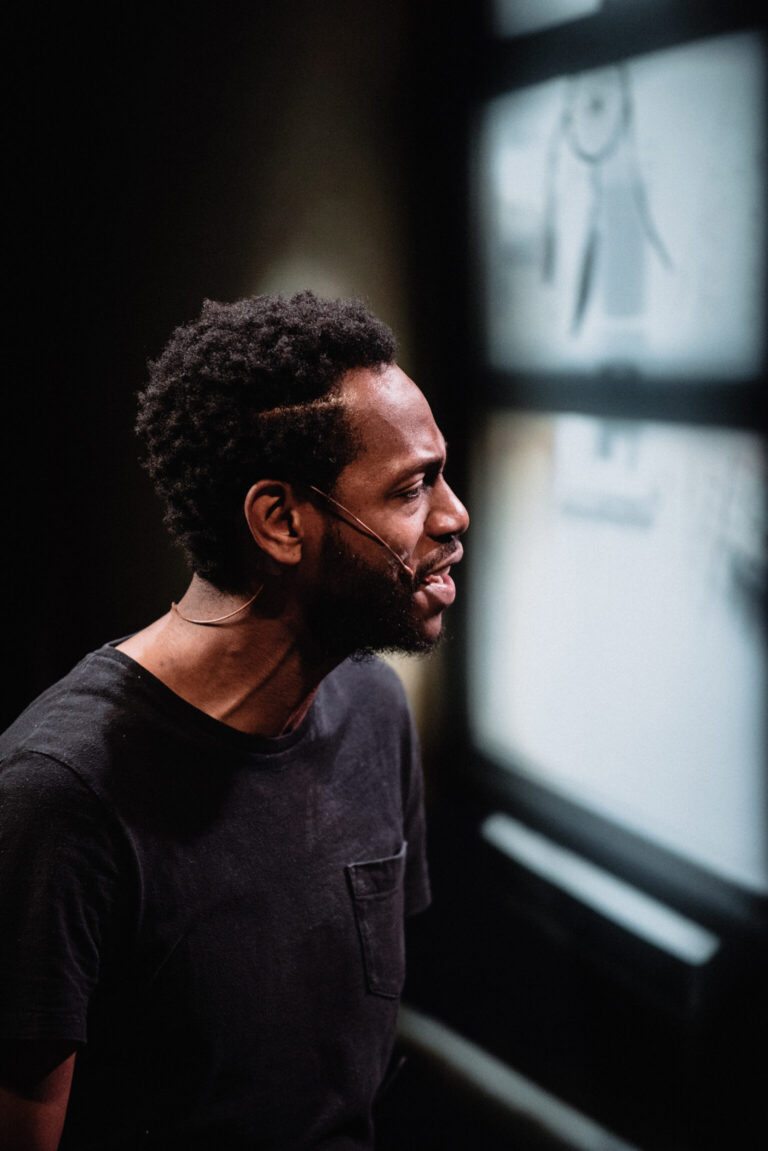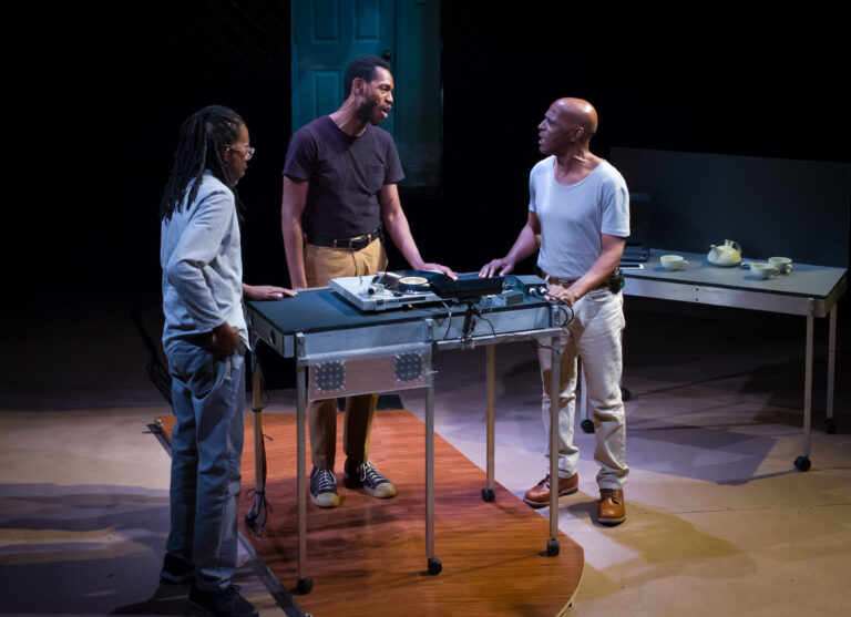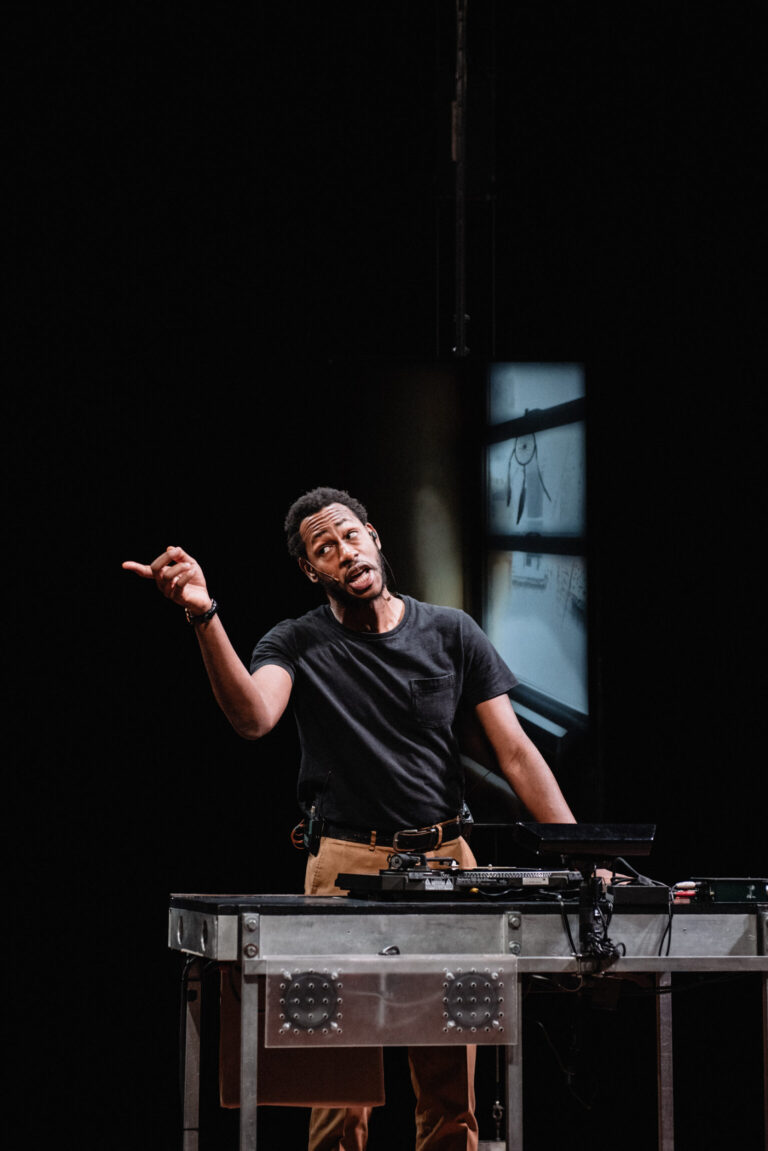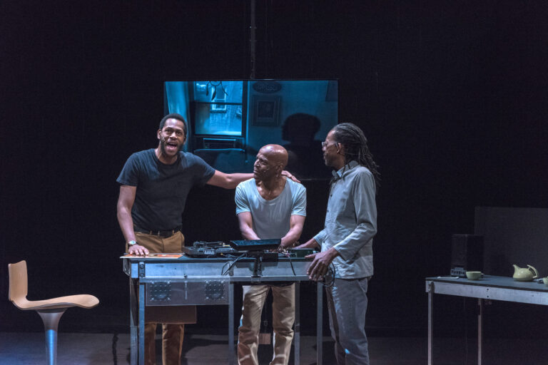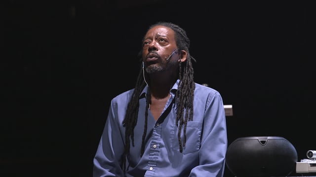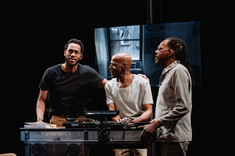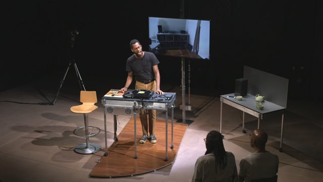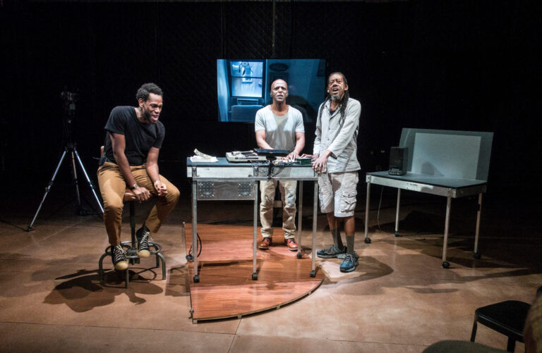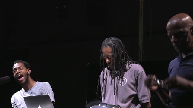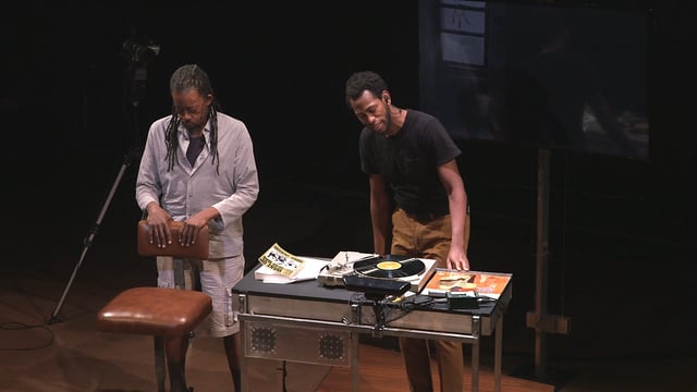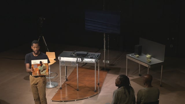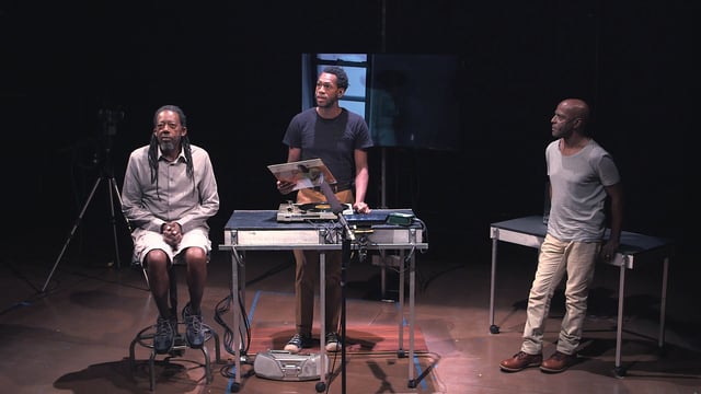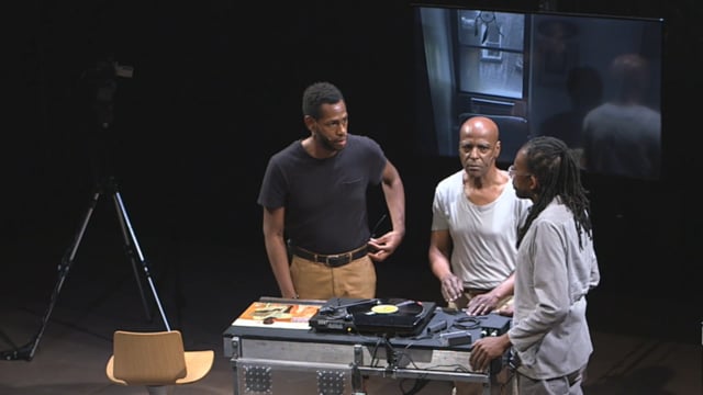 In The B-Side, performers Eric Berryman, Jasper McGruder, and Philip Moore channel the inmates’ voices from the album, via in-ear receivers, and transmit them live, remixing their voices with the original recording. Berryman also provides context from the book Wake Up Dead Man: Hard Labor and Southern Blues by Bruce Jackson, the folklorist who recorded the album in 1964.