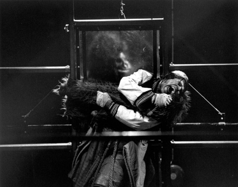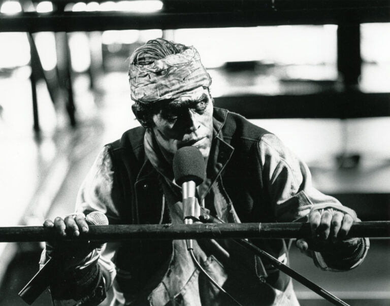 Eugene O’Neill’s 1921 tale of Yank (Willem Dafoe), a stoker on a transatlantic steamship, placed, in The Wooster Group’s version, on a shifting hydraulic network of steel grates and ramps (the set from North Atlantic repurposed backwards). With music by John Lurie.